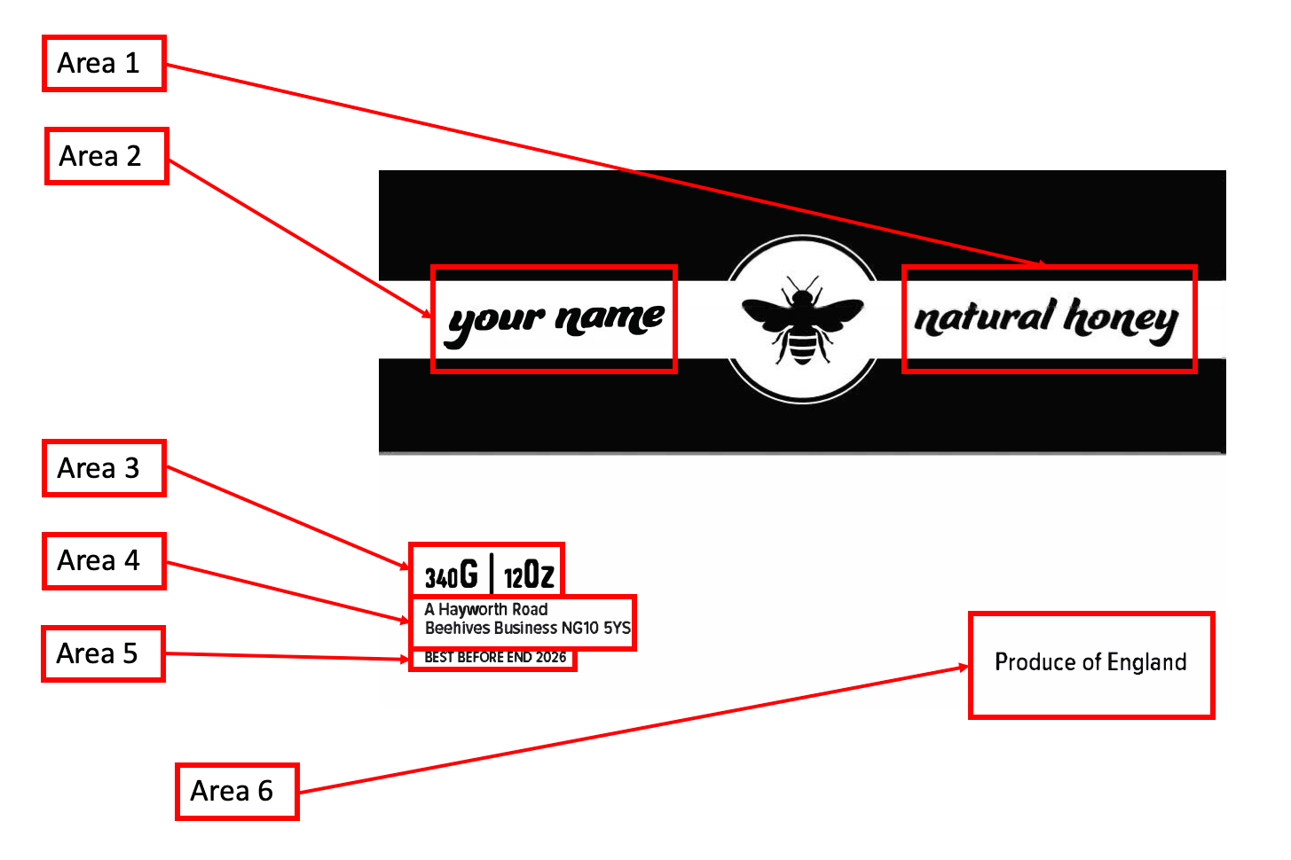 Each clear label includes up to five editable sections, carefully laid out to remain highly legible without obscuring the honey: