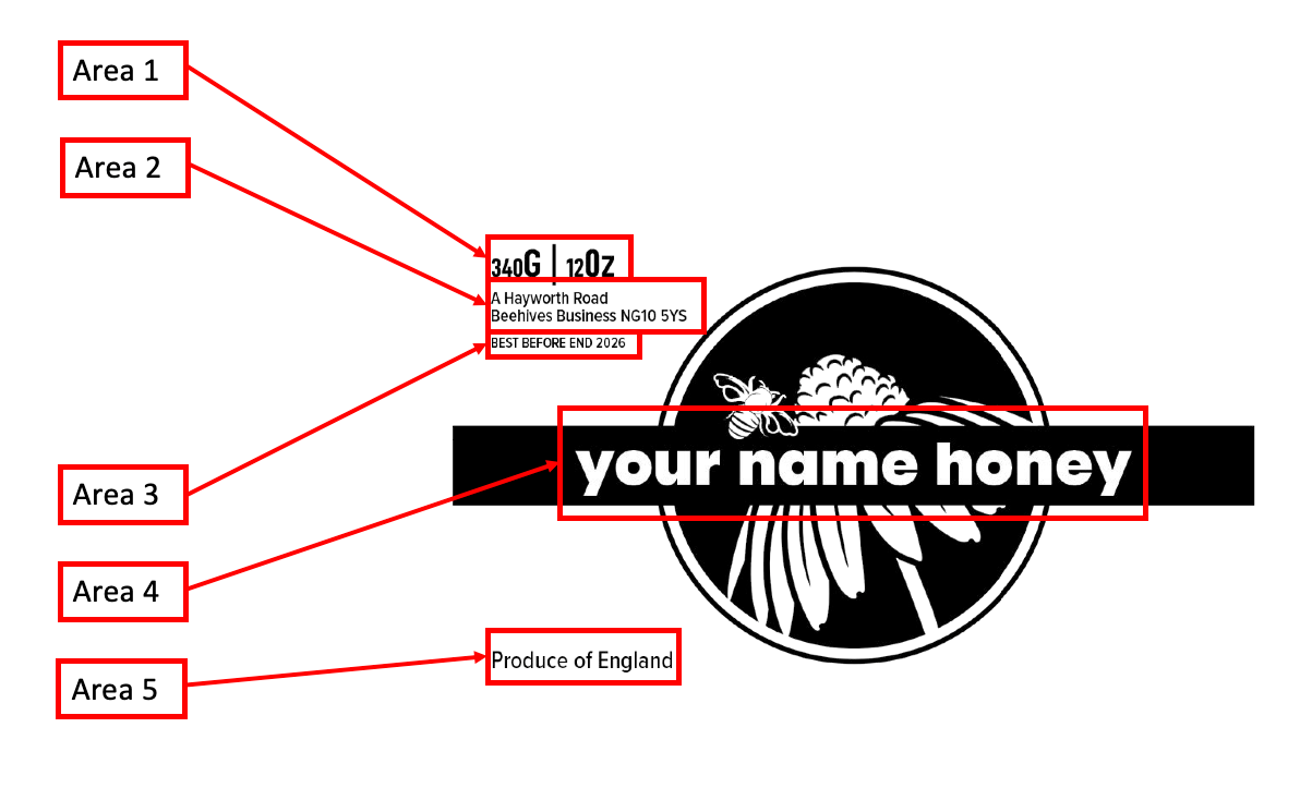 Each clear label includes up to five editable sections, carefully laid out to remain highly legible without obscuring the honey: