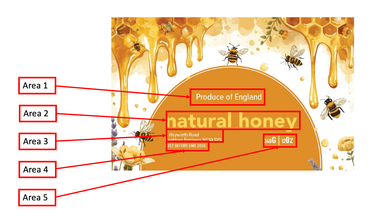 • Clearly state where the honey was produced or packed, e.g. Produce of England.