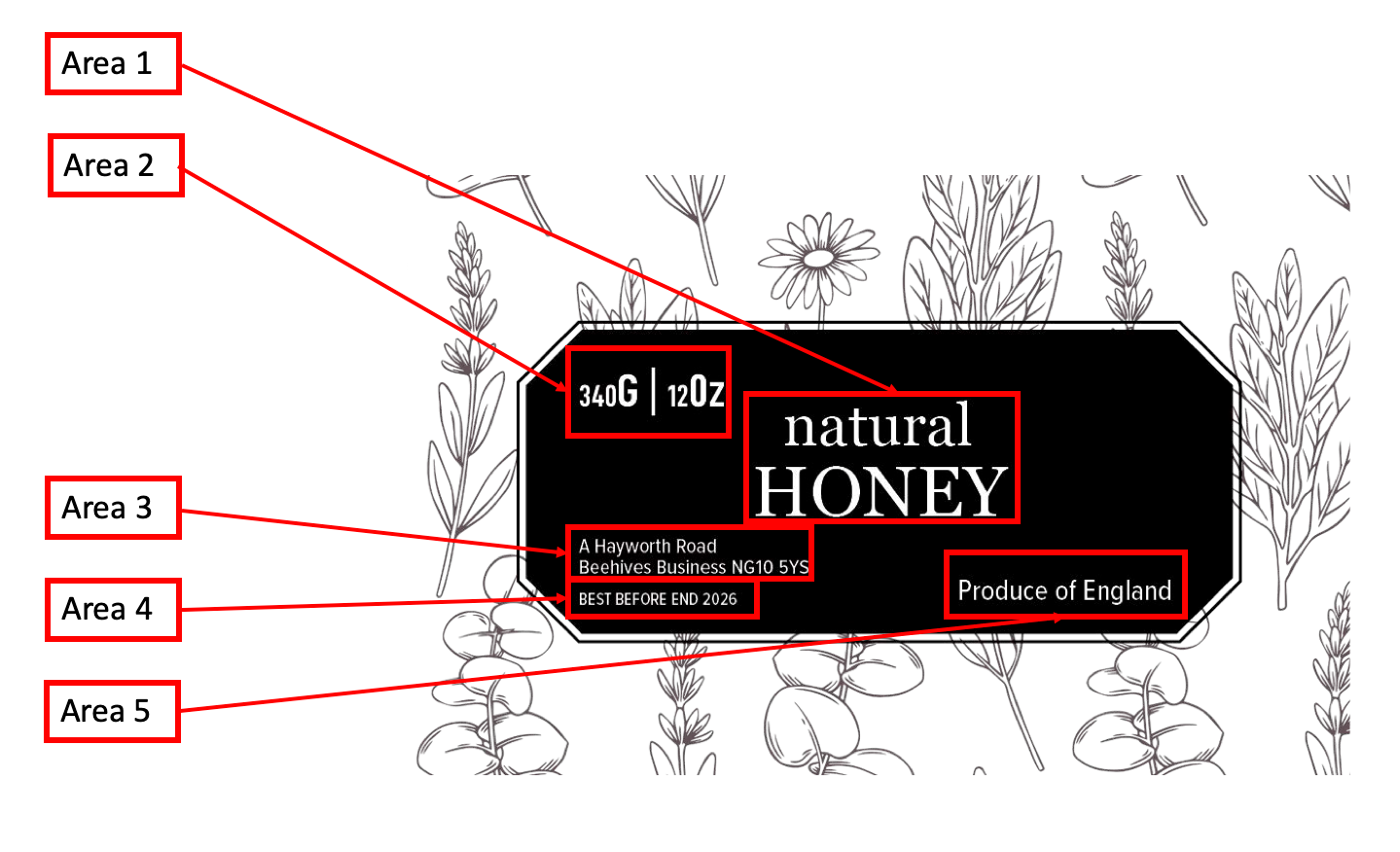 Each clear label includes up to five editable sections, carefully laid out to remain highly legible without obscuring the honey: