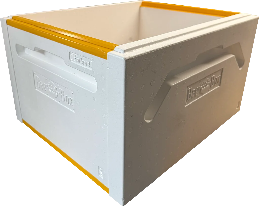 Supplied flat-packed, the hive body is easy to assemble and does not require adhesive. Hard plastic frame runners and reinforced lower edges help protect the polystyrene during inspections, reducing wear from hive tools and regular use. Large, ergonomically moulded handles are built into the hive body to make lifting and handling easier.